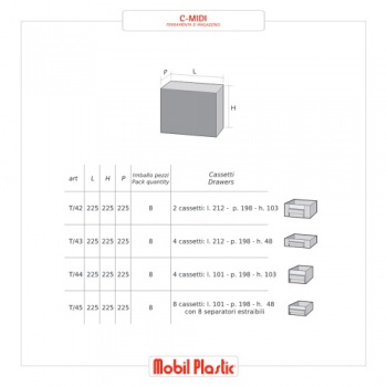 MIDI Modular drawers, made of PST (polysterene), available with external structure in black and 4 transparent drawers.