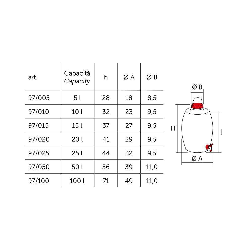 Practical and sturdy small barrel, made of HDPE (High density Polyethyelene), in neutral-white color, with red cap and tap made of PP (Polypropylene). Suitable for food contact. It is recommended to wash thoroughly before use.