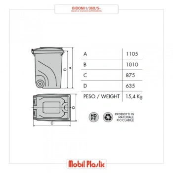 Practical two-wheeled bin, made of HDPE (High density polyethylene), ideal for waste collection, available in monocolor version: blue, yellow, grey, red and light green. The bin is TUV certified according to the EN 840 norm; it is chemical agents and parasites resistant and does not absorb liquids so it is completely washable and sterilisable.