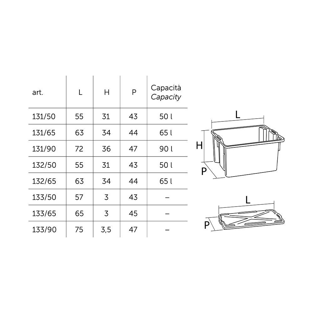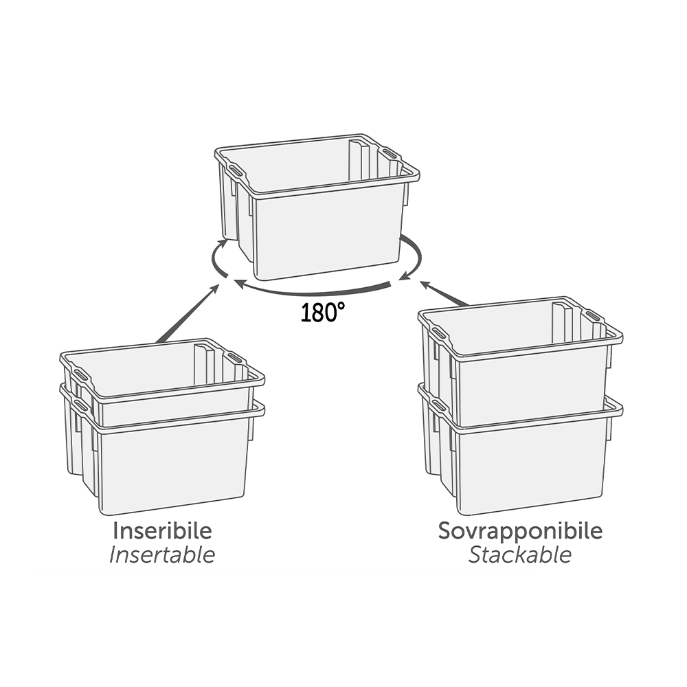 Insertable and stackable crate, made of HDPE (High density polyethylene), in neutral white color, suitable for food contact.