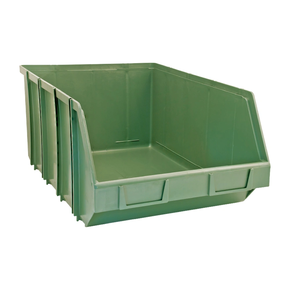 Stackable bins with back and side interlocking system, made of PST AU.
