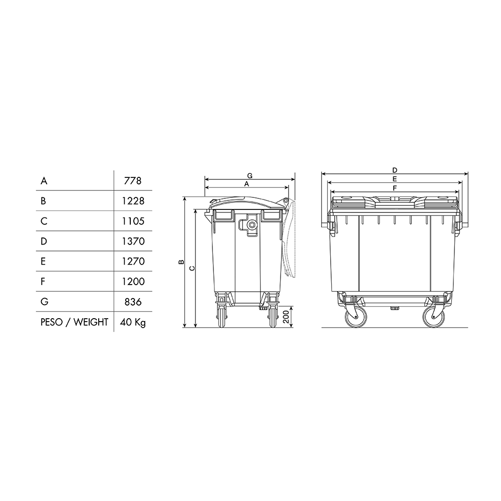 Size: L 1370 (width with lateral handles) x H 1228 x P 778 mm (closed lid)