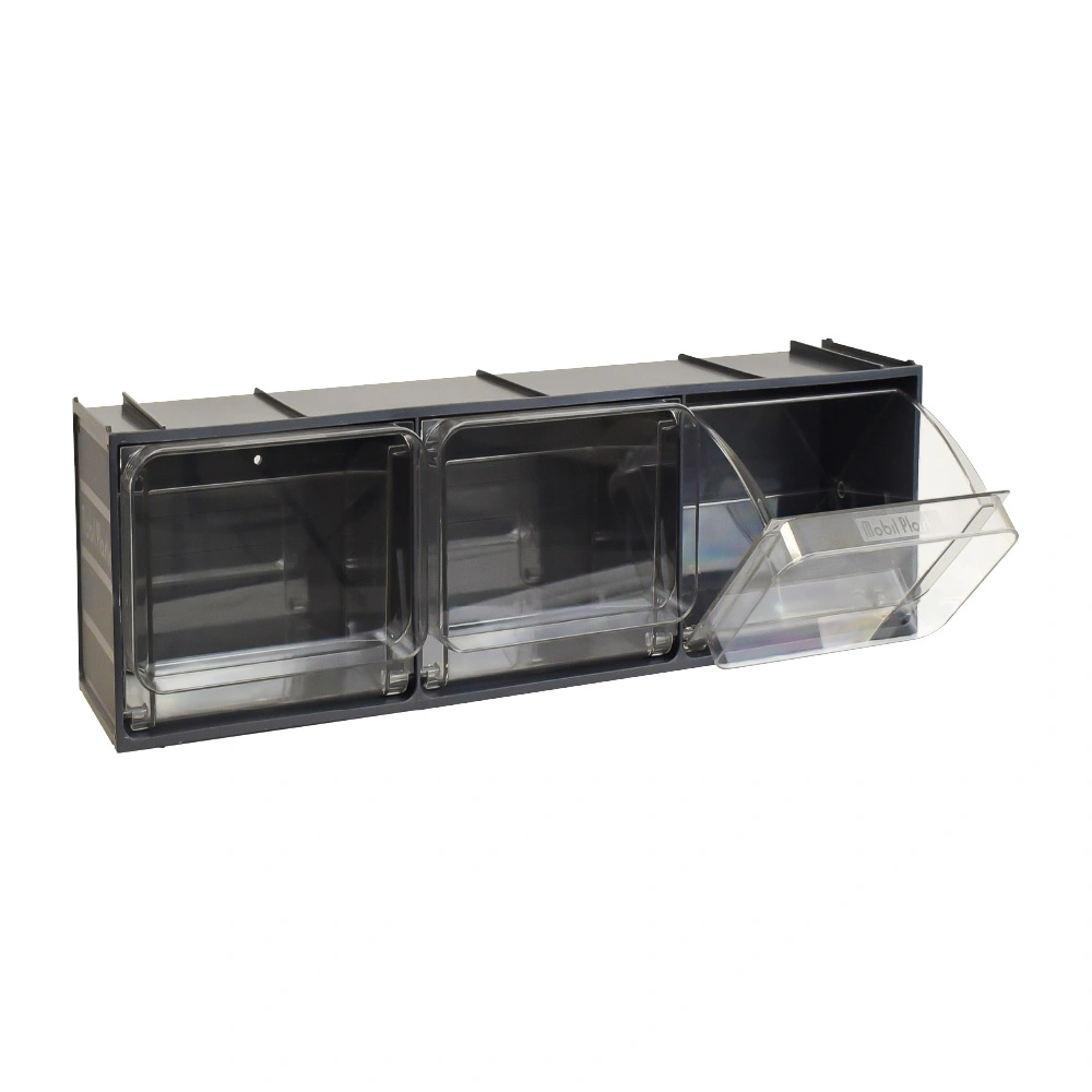 Modular drawers with external structure made of PP (polypropylene) copolymer, 3 tilting drawers made of transparent PET (Polyethylene terephthalate). Made with antistatic materials resistant to aggressive chemical agents and fuels.