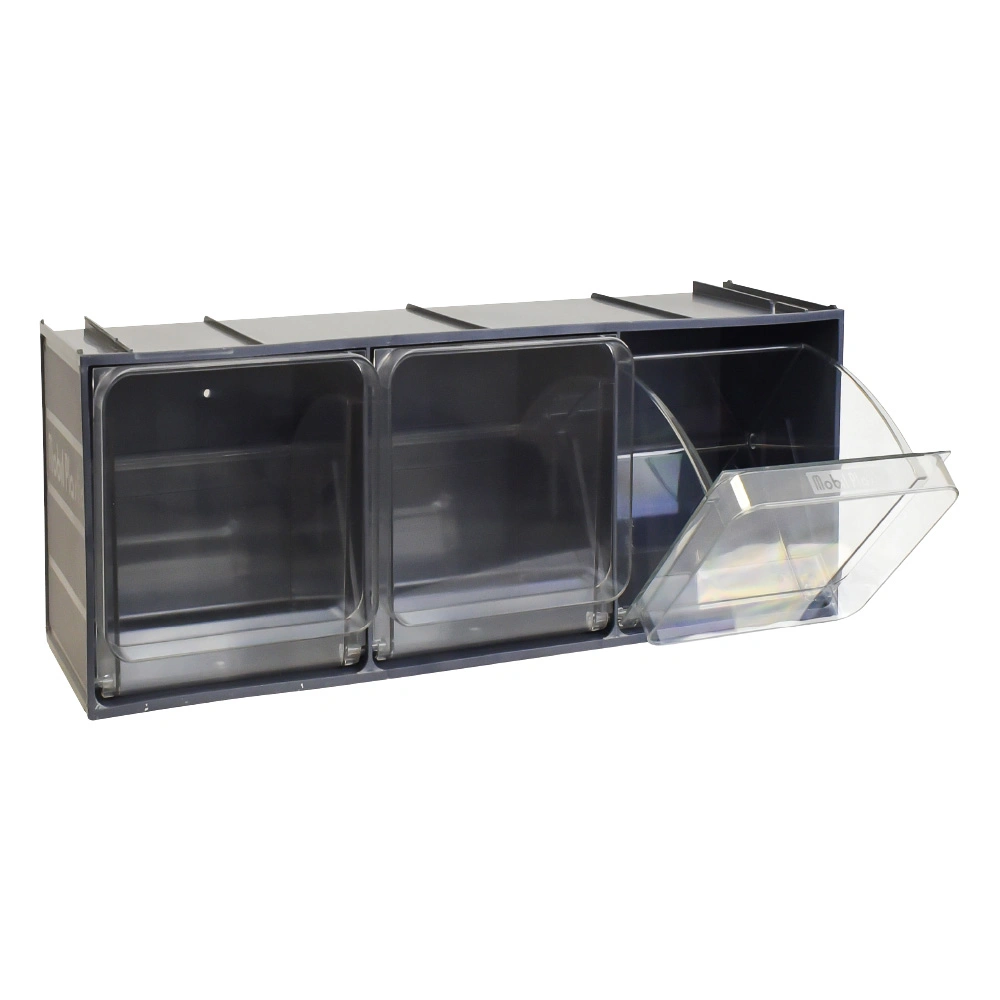 Modular drawers with external structure made of PP (polypropylene) copolymer, 3 tilting drawers made of transparent PET (Polyethylene terephthalate). Made with antistatic materials resistant to aggressive chemical agents and fuels.