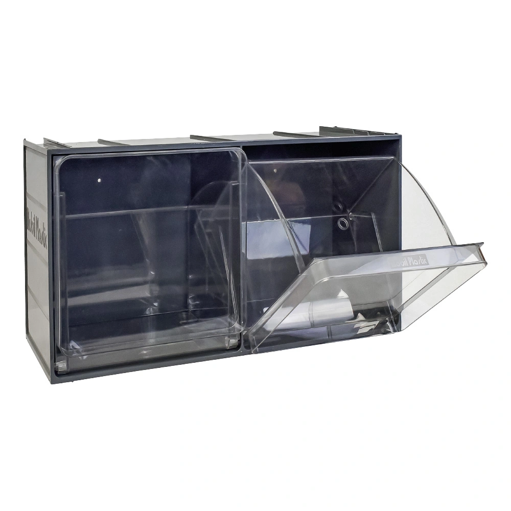 Modular drawers with external structure made of PP (polypropylene) copolymer, 2 tilting drawers made of transparent PET (Polyethylene terephthalate). Made with antistatic materials resistant to aggressive chemical agents and fuels.