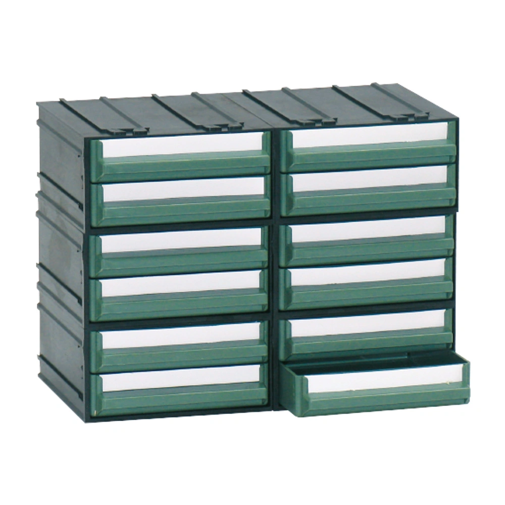 Modular chest of drawers, made of PST (polystyrene) , available with external structure in black and 12 drawers in green or transparent. The drawers can be equipped with removable modular trays.