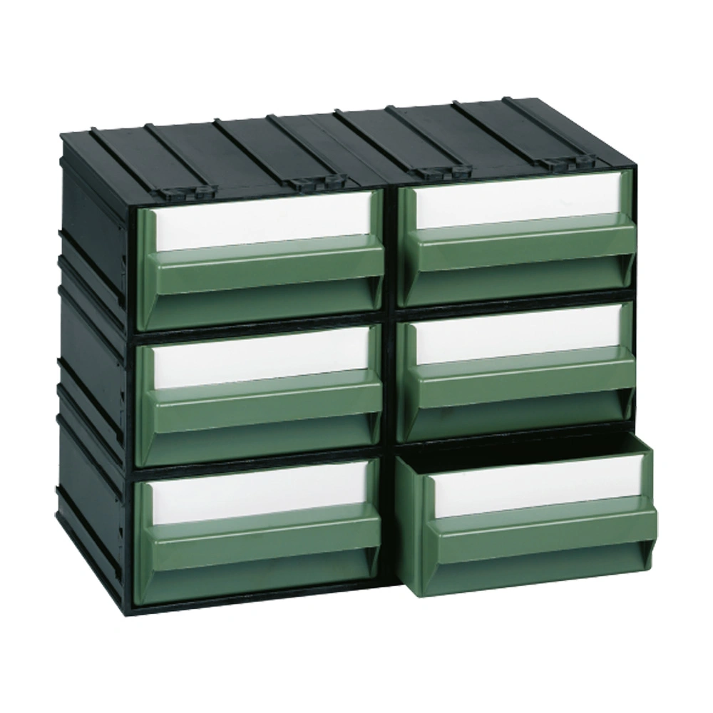 Modular chest of drawers, made of PST (polystyrene) , available with external structure in black and 6 drawers in green or transparent. The drawers can be equipped with removable modular trays.