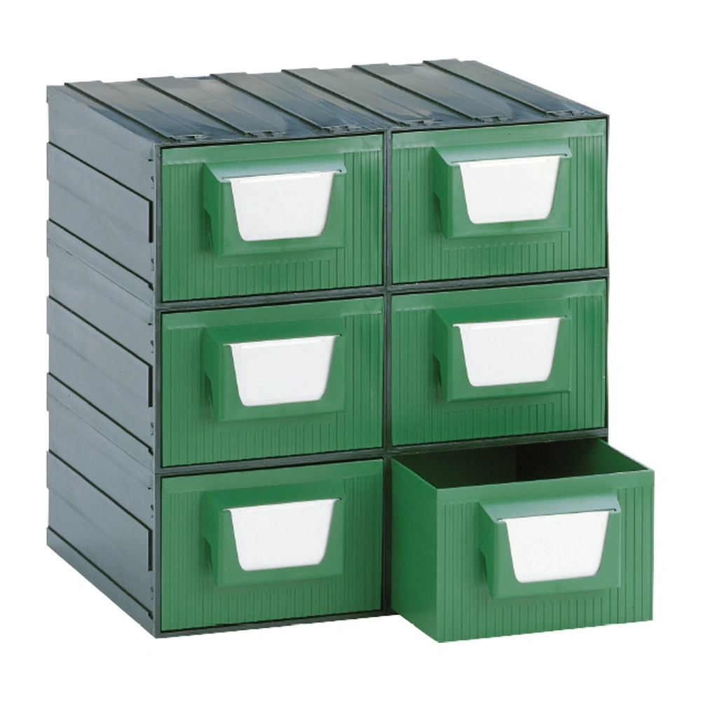 Modules MAXI: modular drawers, made of PST (polysterene), available with external structure in black and 6 drawers in green or transparent.