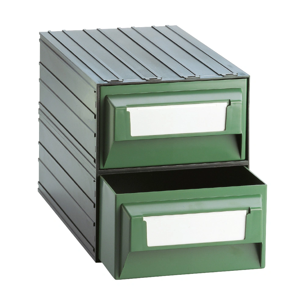 Modules MAXI: modular drawers, made of PST (polysterene), available with external structure in black and 2 drawers in green or transparent.
