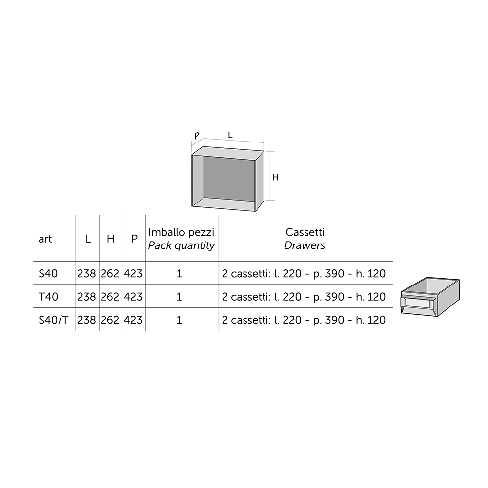 Composition: 2 drawers l. 220 x p. 390 x h 120 mm.