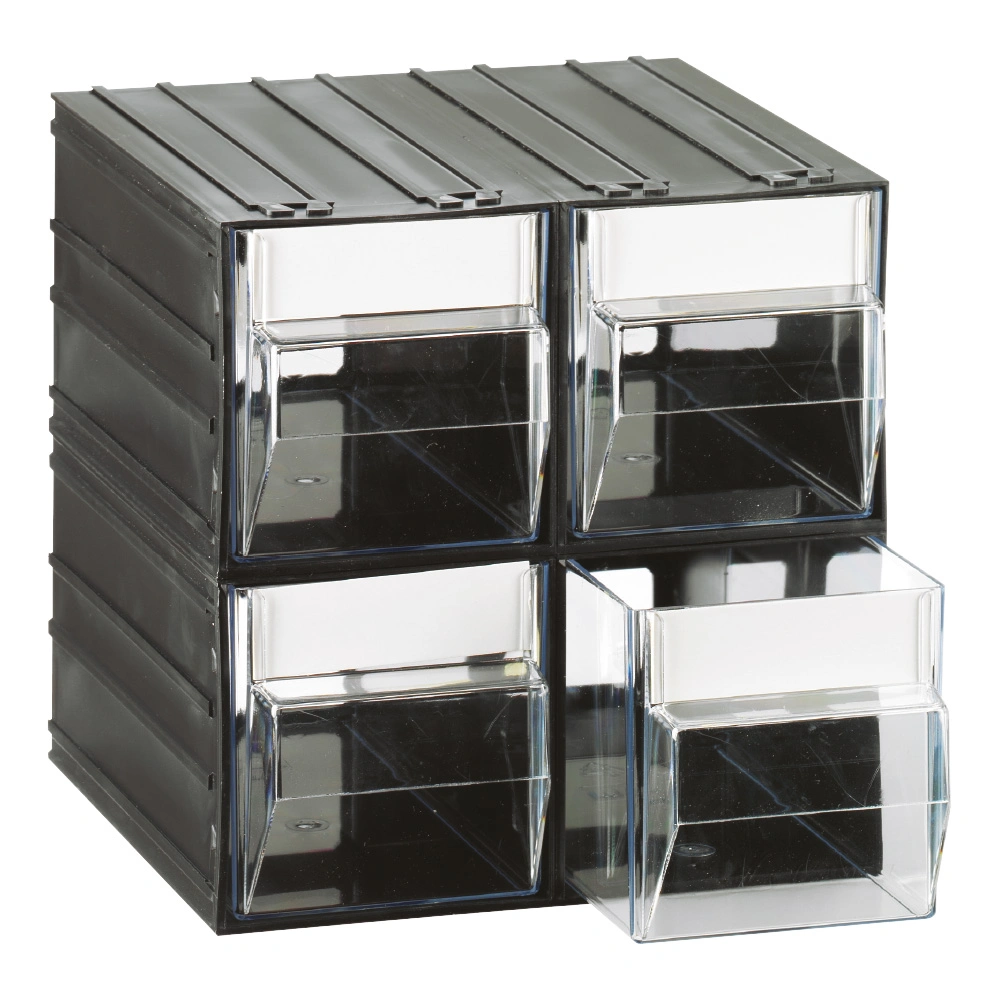 MIDI Modular drawers, made of PST (polysterene), available with external structure in black and 4 transparent drawers.