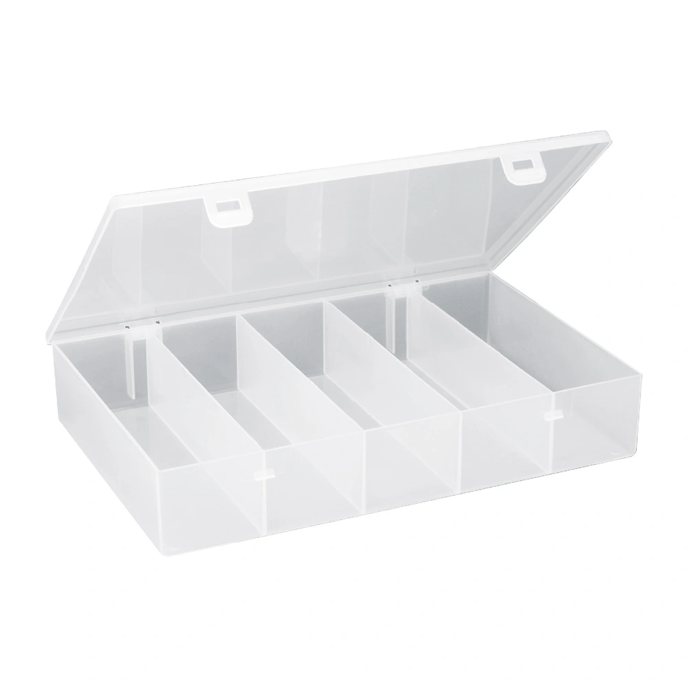 Organizer made of transparent PP, with click-in lock and fixed dividers.