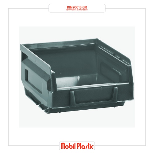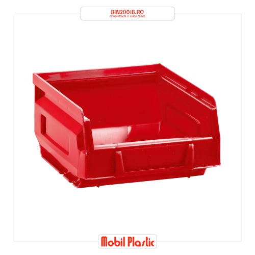 Stackable open-head container, equipped with a hooking tab on the back and made of PEHD (High Density Polyethylene).