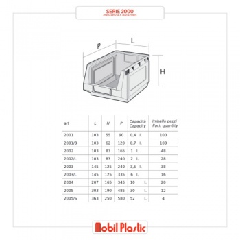 Stackable open-height container, equipped with a hooking tab on the back, made of PEHD (High Density Polyethylene).EXTERNAL DIMENSIONS: L 103 x H 83 x D 240 mmINTERNAL DIMENSIONS: L 90 x H 73 x D 220 mmCAPACITY: 2 LTSTATIC LOAD: Hanging container 2.2 KG Operating temperature: -50° <> + 50° ...Read more