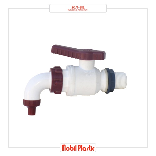 Rubinetto in PP (Polipropilene) bianco con dettagli rossi, compatibile con mastelli enologia/cantina e agricoltura/giardinaggio. Fissaggio con ghiera e guarnizione in gomma o silicone alimentare e becco girevole con sistema salva goccia. Idoneo al contatto con alimenti.