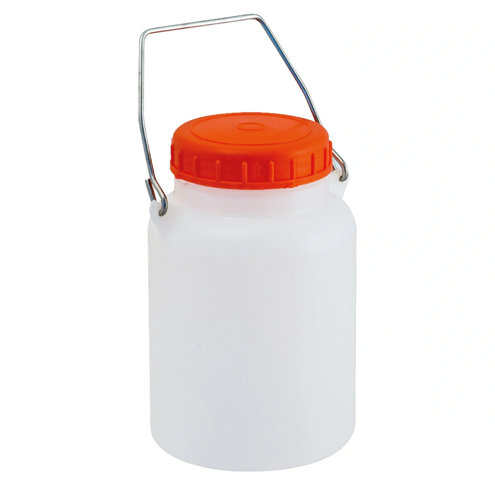 Pratico e robusto bidone a collo largo in PEHD (Polietilene ad alta densità) di colore bianco neutro con tappo in PP (Polietilene) rosso, dotato di guarnizione in gomma alimentare.