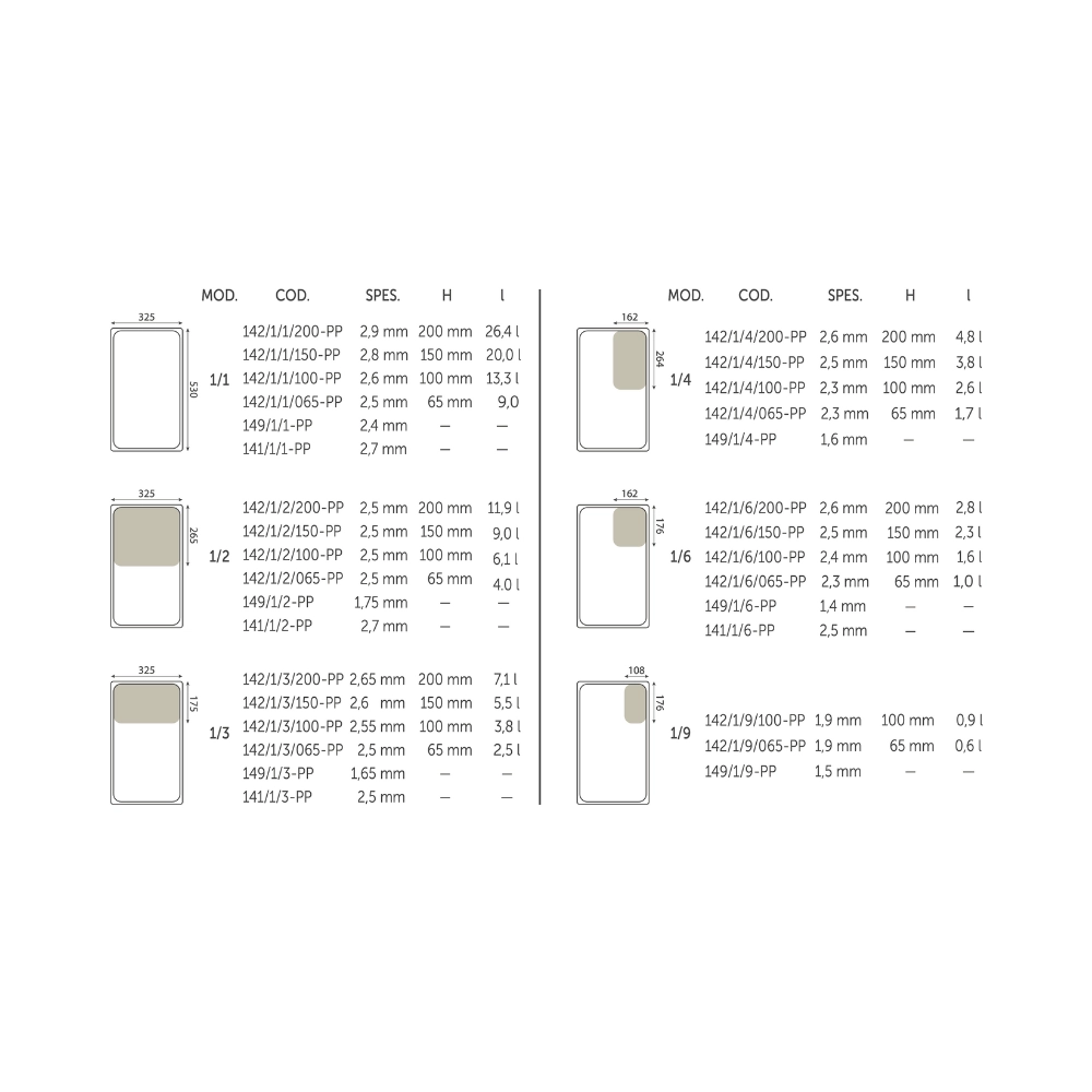 Gli articoli in polipropilene non rientrano nella normativa Gastronorm EN 631, in quanto il naturale ritiro termico del materiale fa sì che le misure perimetrali siano fuori dalle tolleranze della normativa, anche di soli 2-3 mm.