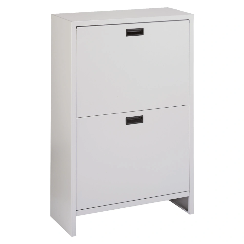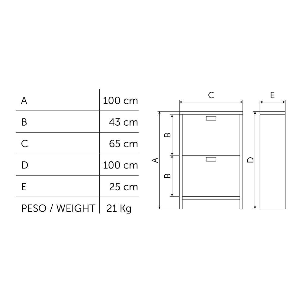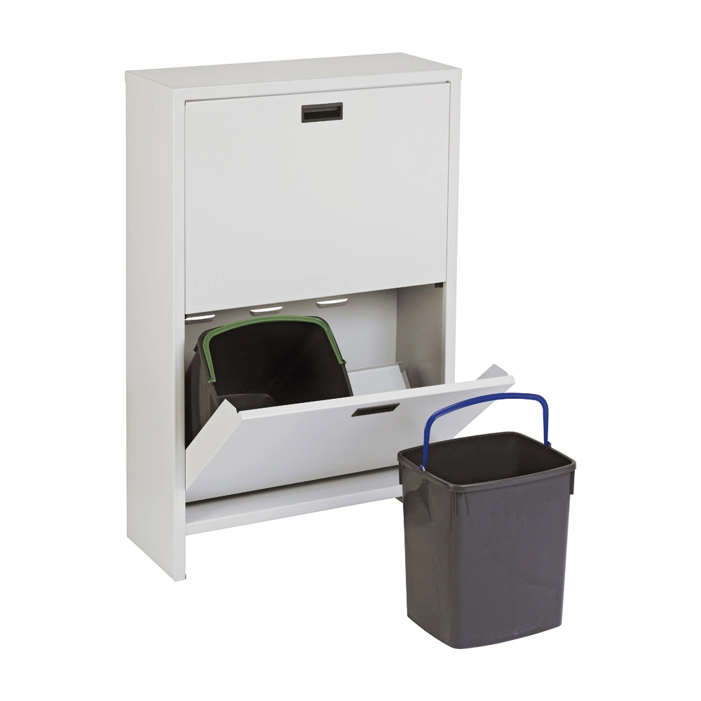 Pratico e robusto mobiletto in lamiera elettrosaldata verniciata a forno in polvere epossidica di colore grigio chiaro, dotato di due ribalte sovrapposte “salva-spazio”, con apertura indipendente, contenenti due secchi porta rifiuti da 20 LT, realizzati in PP (Polipropilene), grigi con manico colorato (blu, giallo, rosso e verde) ciascuna.